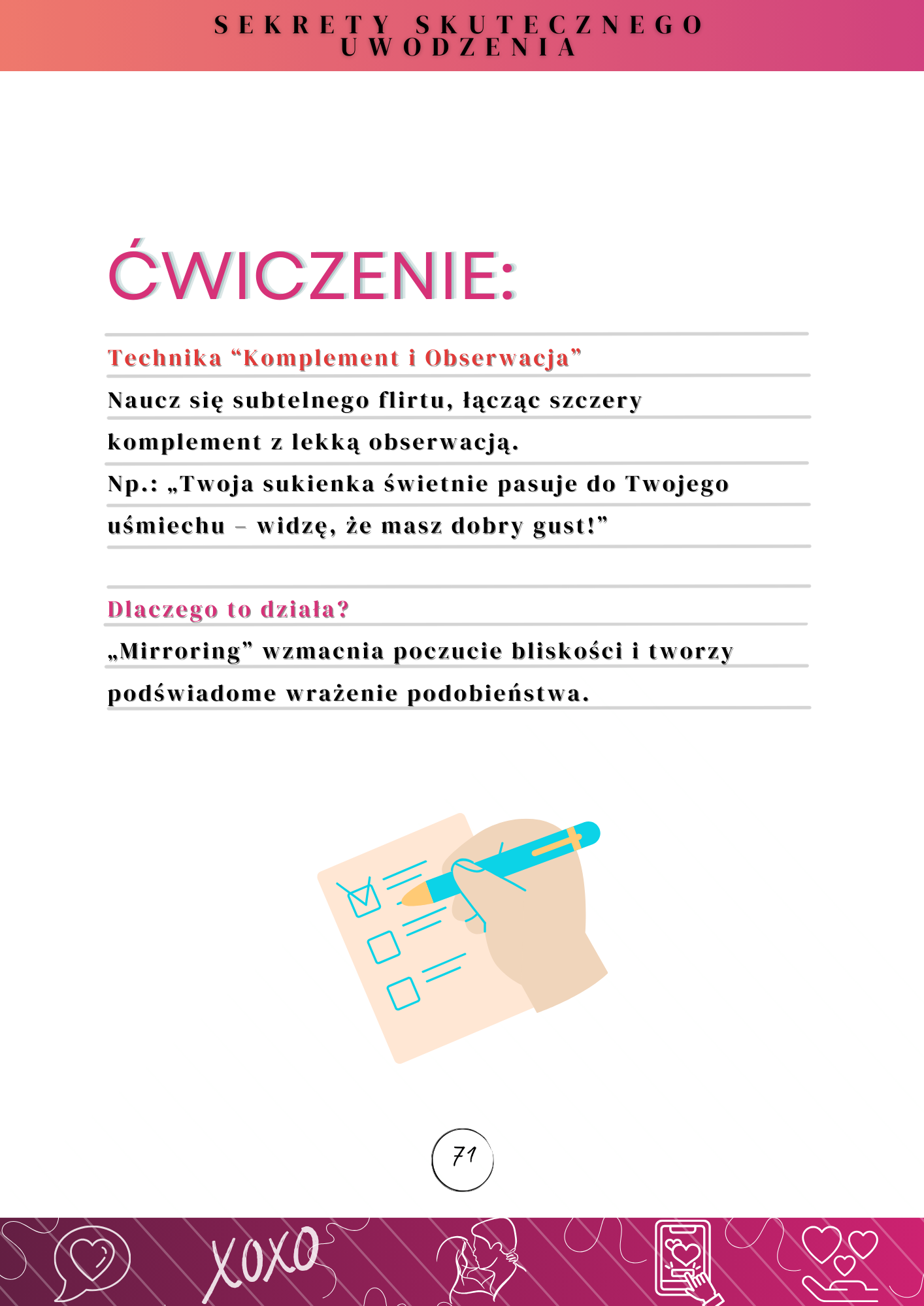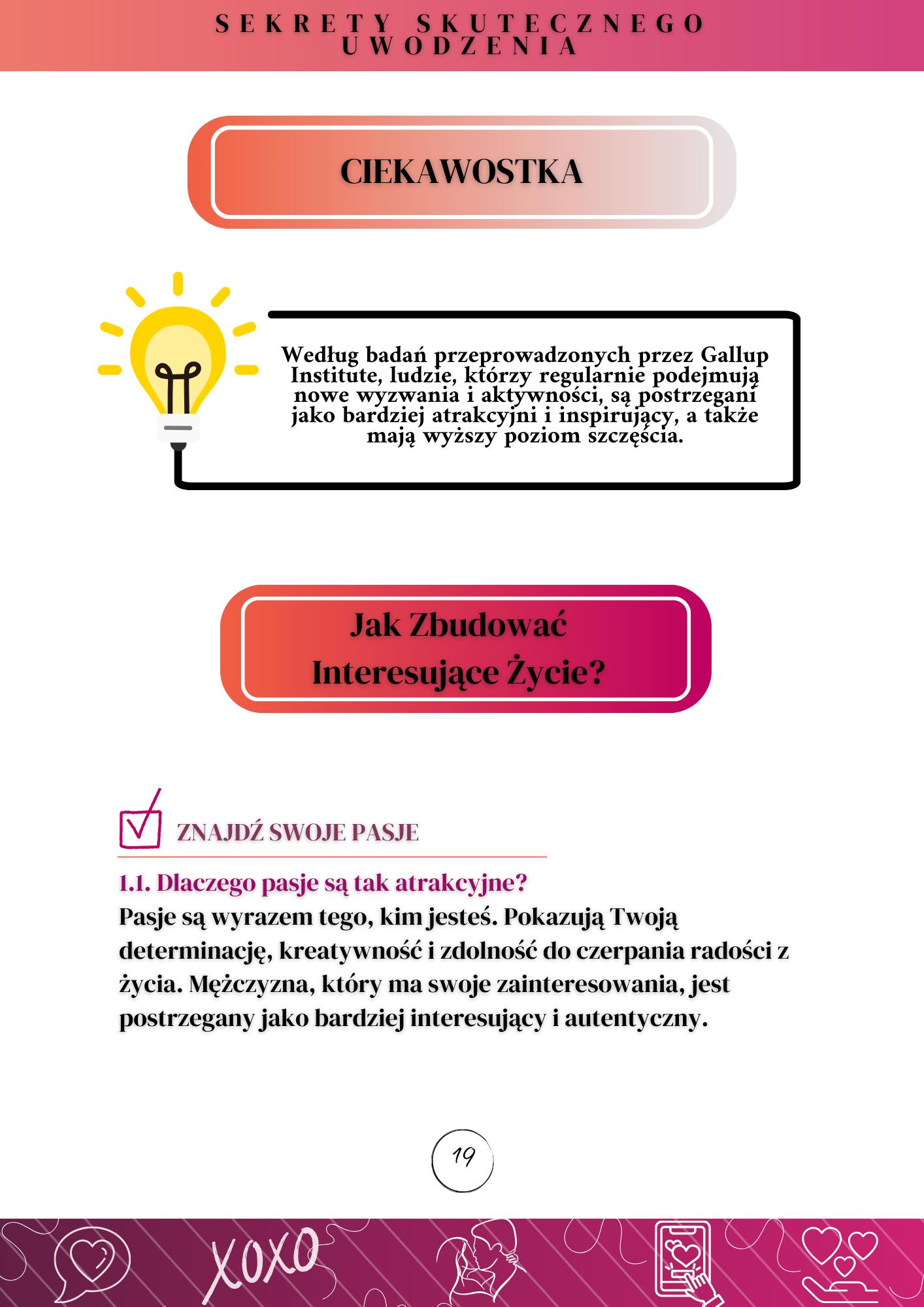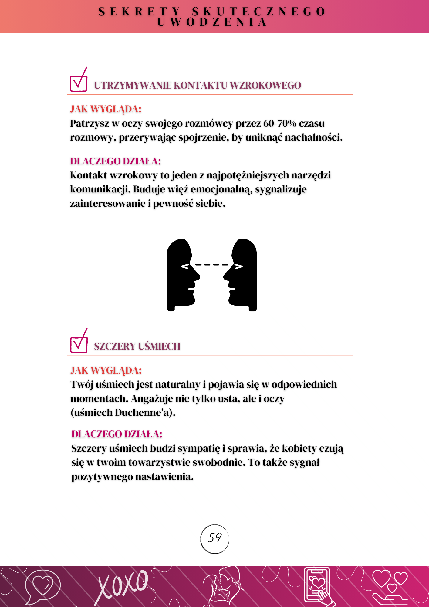 „Sekrety Skutecznego Uwodzenia” to eBook, który odkrywa mechanizmy stojące za atrakcyjnością i budowaniem relacji. Nie znajdziesz tu oklepanych sloganów czy pustych obietnic. Znajdziesz coś znacznie cenniejszego – konkretne, praktyczne kroki, które możesz wprowadzić już dziś, by zmienić swoje życie.