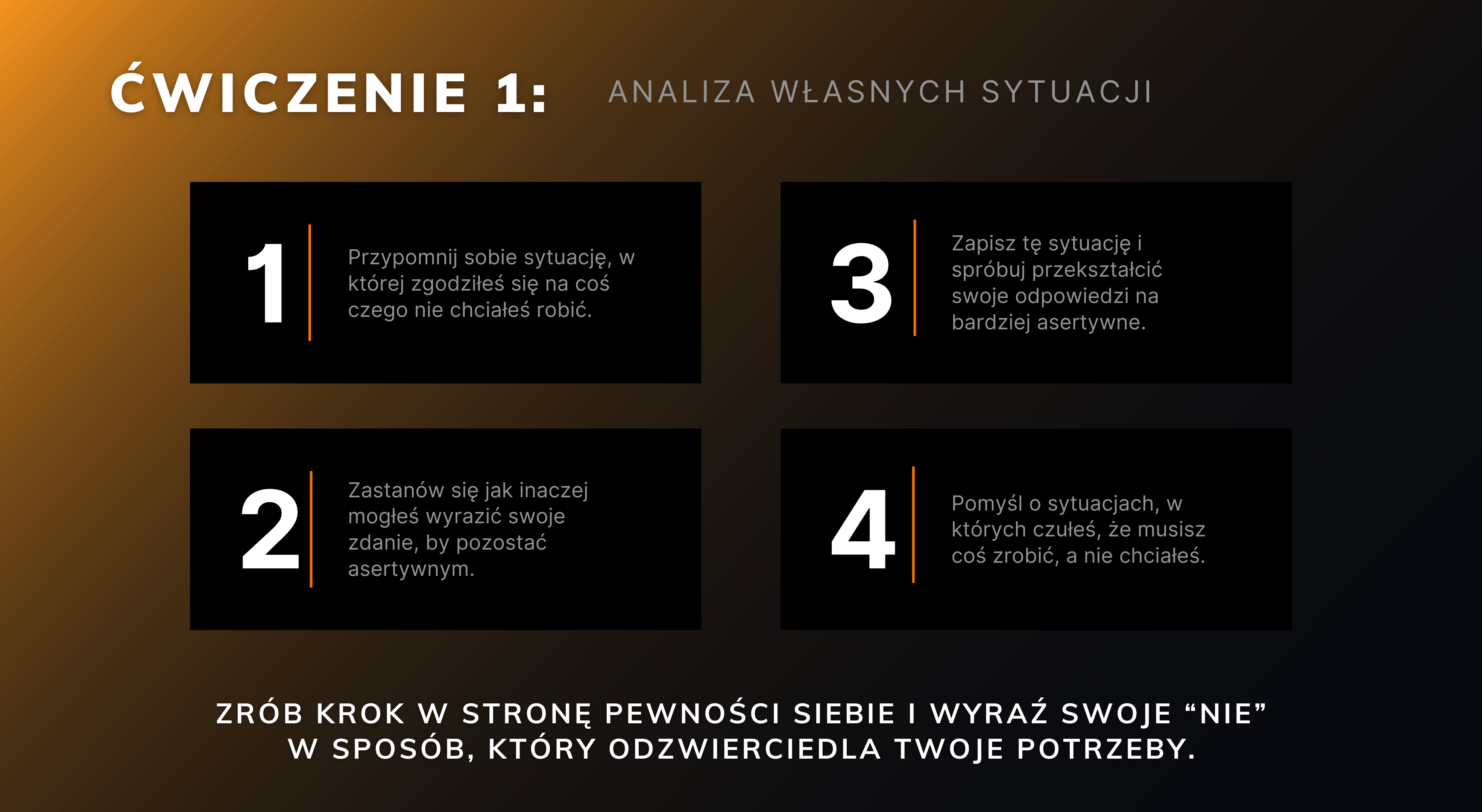 Miewałam trudność z odmową, przez co brałam na siebie za wiele. Po kursie umiem asertywnie powiedzieć ‚nie’ i jasno określić swoje granice. Już nie czuję, że ktoś mnie wykorzystuje. Mam kontrolę nad sytuacją i więcej energii na sprawy naprawdę ważne.